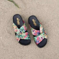 Step into Alegrias lightweight recovery flip-flop, your go to style for everyday comfort and port-workout support. Featuring RecoverMe™ technology, the Ode sandal sits on a soft rocker bottom that is ergonomically designed to the contours of the foot. Available in a fresh range of colors and prints that will make your feet happy indoors or outdoors.